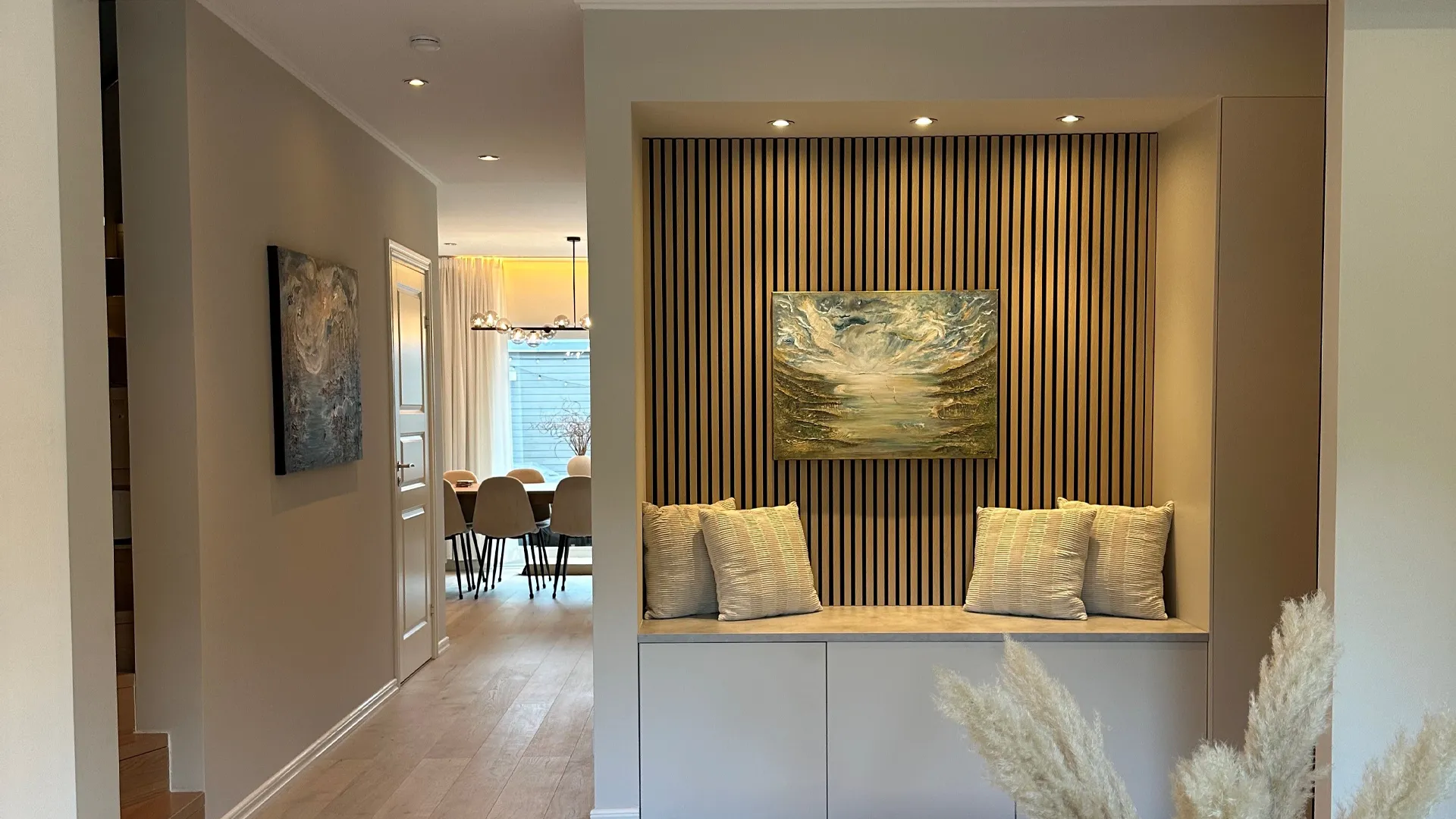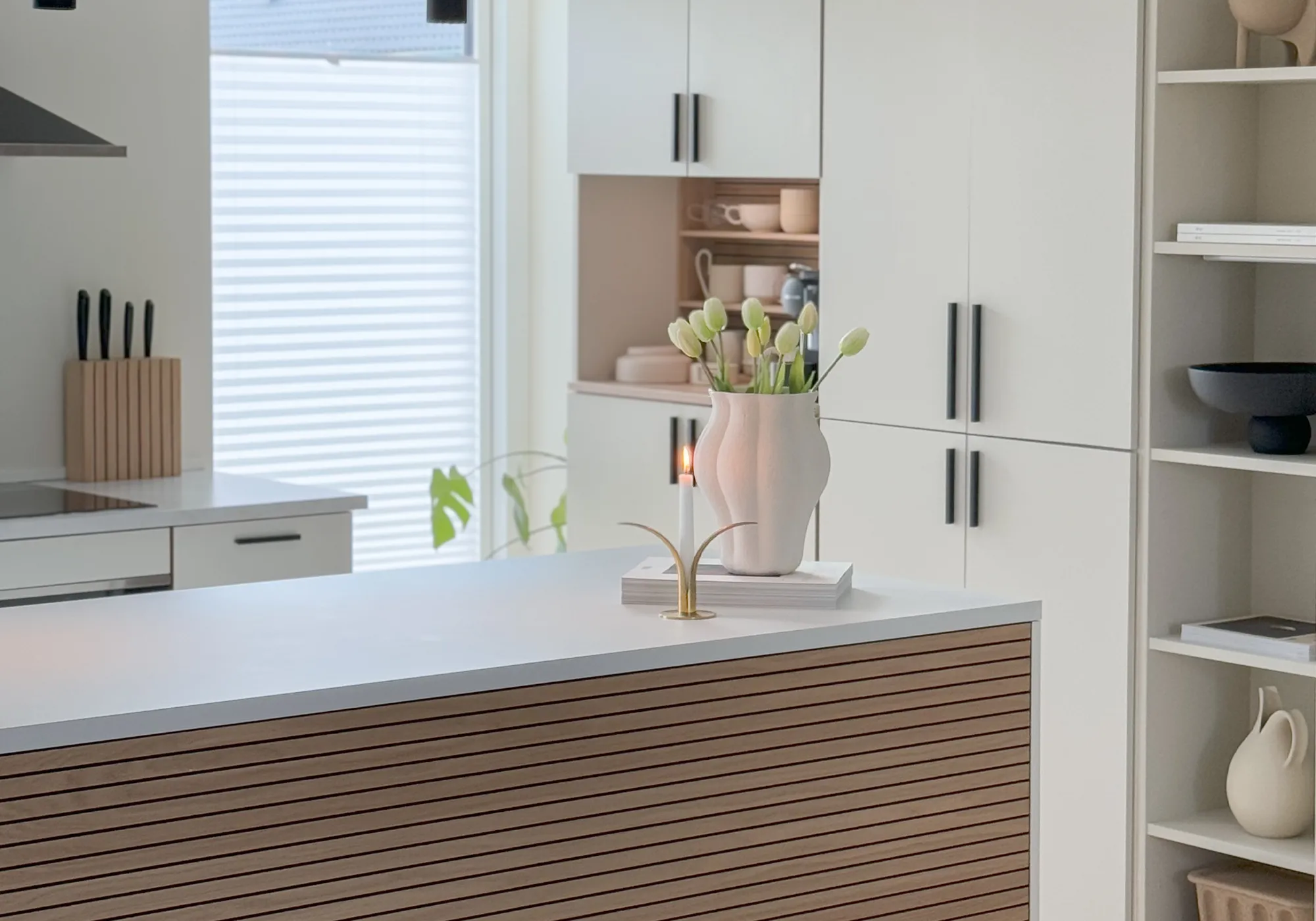 Vi introduserer ThinRibbon-lamellpanelet i tre, som har en unik design som gjør at du kan nyte det fascinerende mønsteret av treårer som strekker seg over én eller flere lameller. Dette særpreget gir en autentisk trestruktur til ethvert rom som er utsmykket med panelet. Samspillet mellom tremønsteret og de slanke sporene mellom lamellene bidrar til et harmonisk uttrykk.