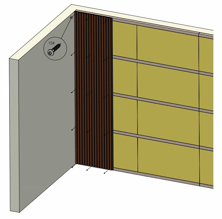 Det finnes ulike måter å montere ribbede veggpaneler, våre akustikkpaneler, på. Du kan skru eller lime ribbede paneler på eksisterende vegger/tak. Hvis du ønsker enda bedre akustikk i rommet, kan du montere 45 x 45 mm stendere og sette inn isolasjon (45 mm) mellom dem, noe som gir deg lydklasse A.