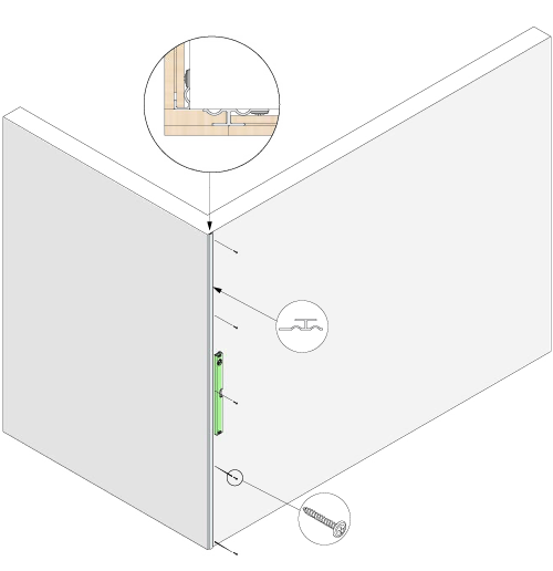 2. Når du monterer et ytre hjørne med en avslutningslist, begynner du med å montere en JOINT-profil. Kontroller at du går over kanten nok til å dekke både veggpanelet og spalten før du skruer JOINT-profilen på plass og sørger for at den er rett.